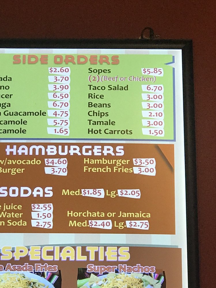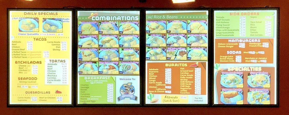 - For lunch or dinner, their carne asada burritos and cooked-to-order tacos range from adobada to beef, all reasonably priced.